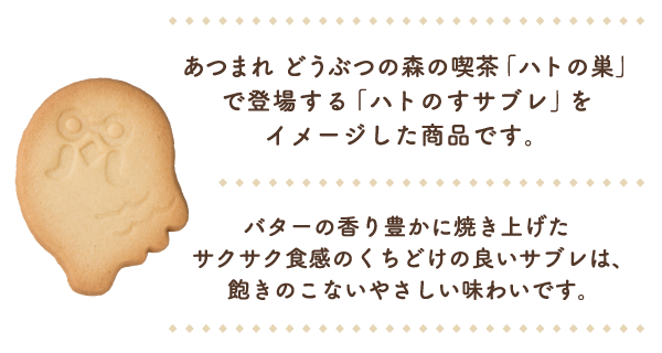 どうぶつの森ハトの巣サブレ あつまれ どうぶつの森の喫茶「ハトの巣」で登場する「ハトのすサブレ」をイメージした商品です ハトの巣サブレボックス 税込810円(本体価格750円) 特定原材料等28品目: 小麦・卵・乳 ハトの巣サブレ 税込270円(本体価格250円) 特定原材料等28品目: 小麦・卵・乳